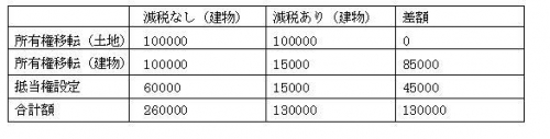 たとえば、土地1000万円・建物500万円の評価額(売買価格とは異なります。)の土地、建物を、銀行から1500万円の借り入れをして購入したとします。登録免許税の軽減をを受けた場合と受けなかった場合で、下記のような金額の差が出ます。
